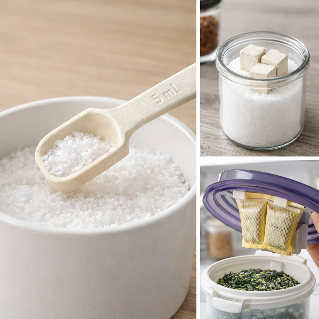 こういう“ちょっとした使いづらさ”って、毎日だと地味にストレスです。特に、よく開け閉めする調味料や乾物は、キッチンの湿気を受けやすく、気づくと固まりやすくなります。そこで便利なのが、乾燥スプーンや食品用乾燥剤みたいな「湿気対策の隙間アイテム」です。