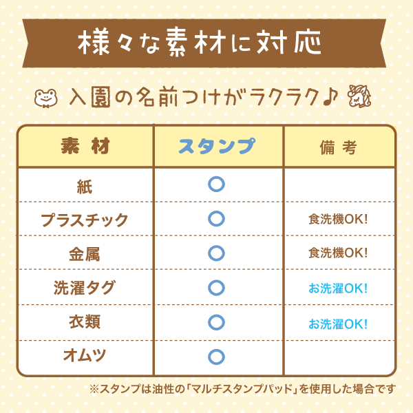 おむつや色鉛筆、食器などにも押せて消えにくい、油性マジック感覚で使えるのもおすすめポイント!