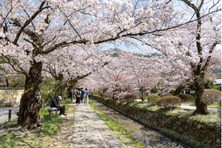 小川に沿って続く細い道に、桜並木が寄り添う京都屈指の散歩道。
