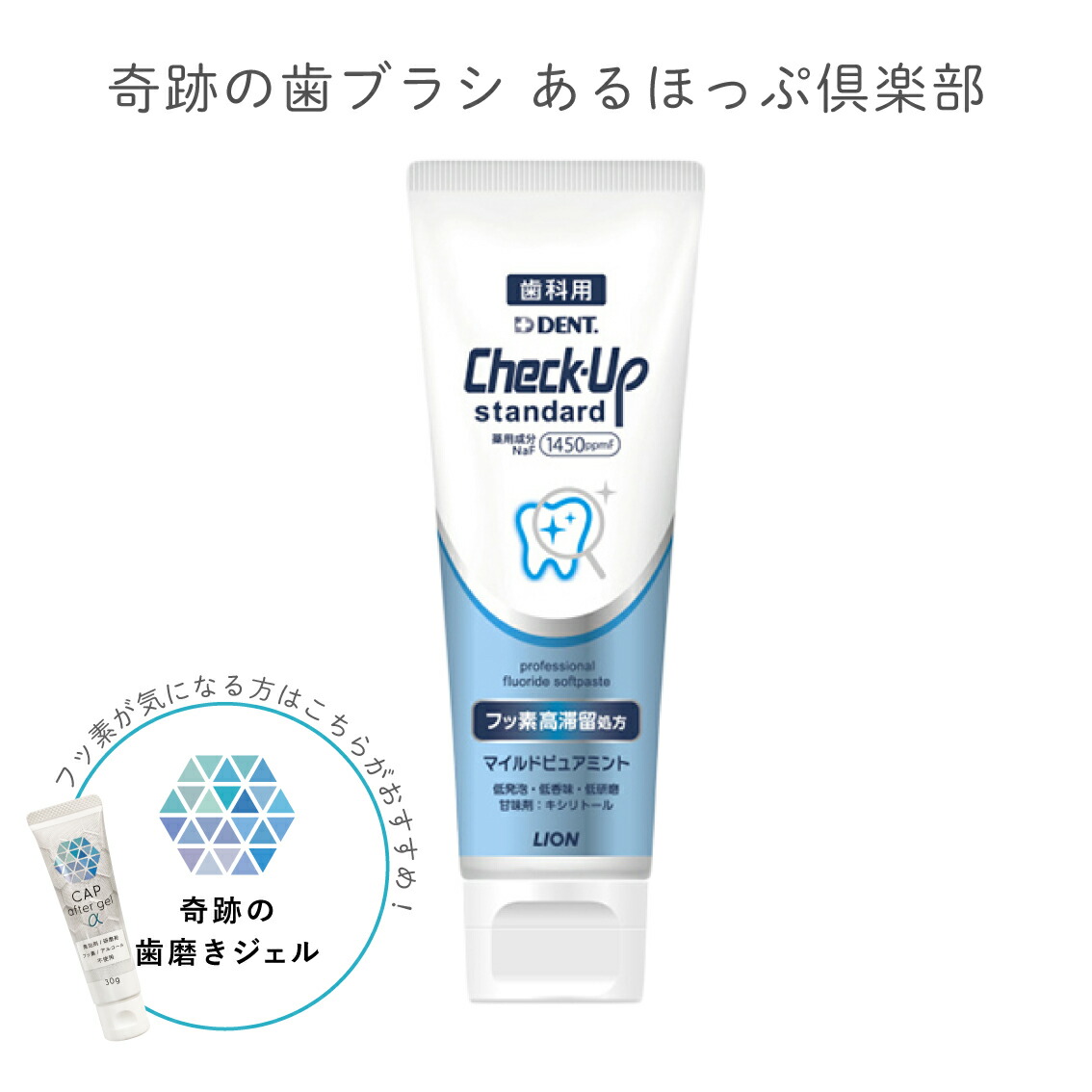 Check-Up standard は 高濃度フッ素1450ppm配合。フッ素高滞留処方で口の中に留まりやすく、フッ素が広がりやすいソフトペースト、歯や歯ぐきにやさしい低研磨性が特長です。